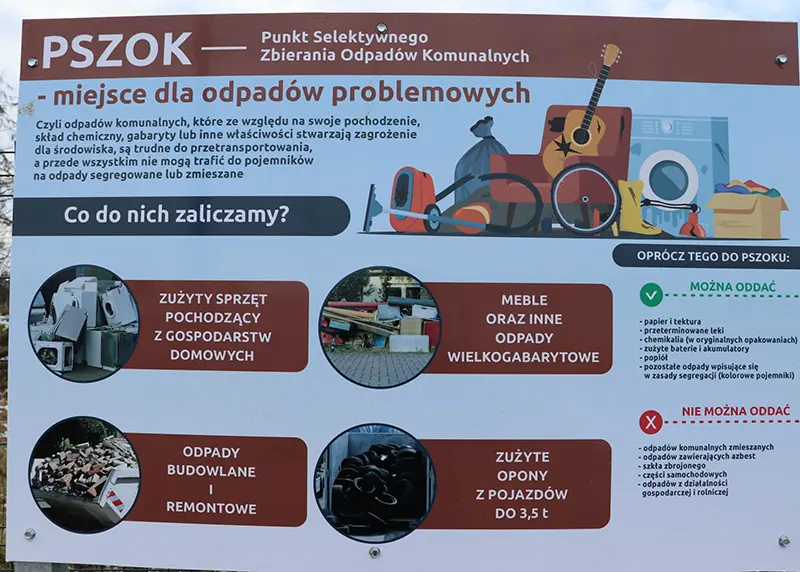 Mieszkańcy będą mogli przywozić do PSZOK między innymi papier, metale, szkło, tworzywa sztuczne, bioodpady, meble i inne odpady wielkogabarytowe, a także odpady budowlane i rozbiórkowe. Punkt przyjmie również odpady niebezpieczne, takie jak zużyte chemikalia czy farby, oraz zużyty sprzęt elektryczny i elektroniczny. Dzięki temu część odpadów, która dziś trafia do pojemników ogólnych, będzie mogła być zagospodarowana w bardziej kontrolowany i bezpieczny sposób.