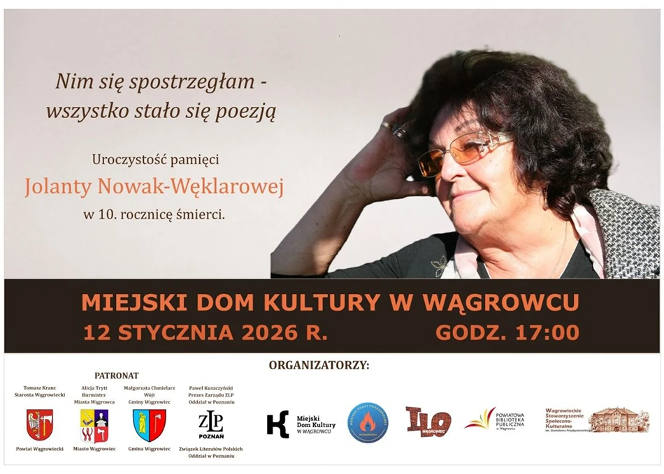 W poniedziałek, 12 stycznia 2026 roku, w Miejskim Domu Kultury w Wągrowcu odbędzie się uroczystość poświęcona Jolancie Nowak-Węklarowej – w 10. rocznicę jej śmierci.