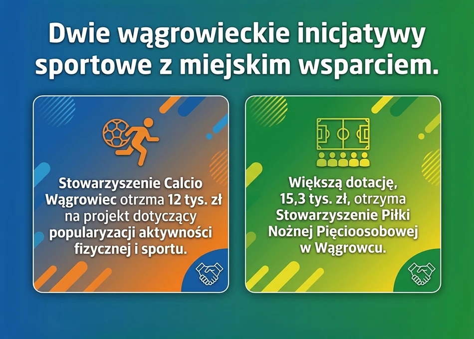 Stowarzyszenie Calcio Wągrowiec otrzyma 12 tys. zł na projekt dotyczący popularyzacji aktywności fizycznej i sportu. W ramach zadania od marca do końca 2026 roku mają być prowadzone treningi dla czterech grup wiekowych. Trzy z tych grup zaplanowano do udziału w rozgrywkach ligowych. Projekt obejmuje także uczestnictwo w meczach ligowych organizowanych przez Wielkopolski Związek Piłki Nożnej oraz w turniejach ogólnopolskich.