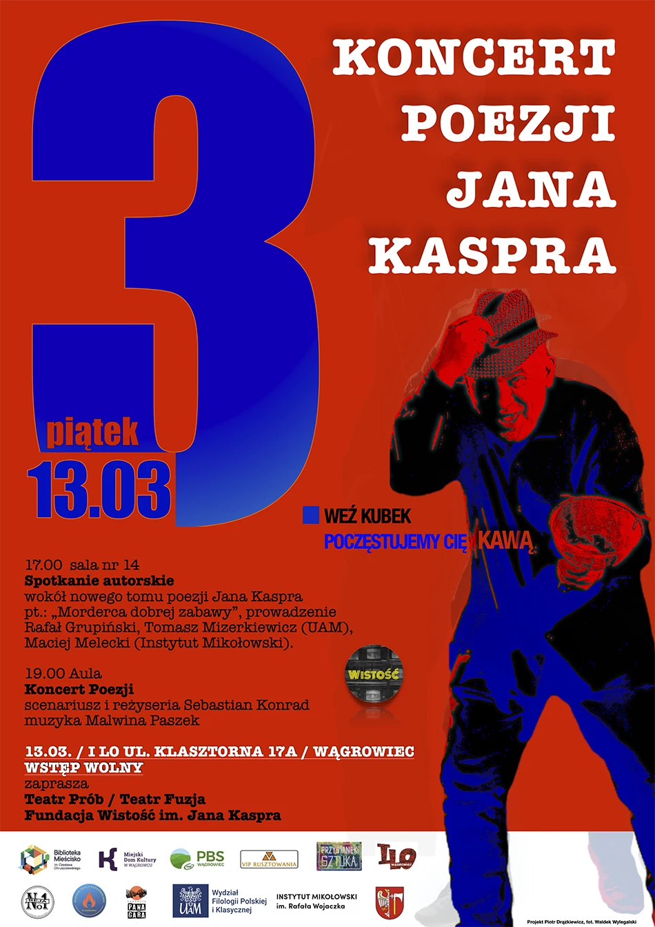 O godzinie 17.00 w sali nr 14 odbędzie się spotkanie autorskie wokół nowego tomu poezji Jana Kaspra „Morderca dobrej zabawy”. Rozmowę poprowadzą Rafał Grupiński, Tomasz Mizerkiewicz z UAM oraz Maciej Melecki z Instytutu Mikołowskiego. O 19.00 w auli liceum rozpocznie się Koncert Poezji Jana Kaspra – scenariusz i reżyserię przygotował Sebastian Konrad, a oprawę muzyczną Malwina Paszek. Wystąpią byli aktorzy Teatru Prób, oraz młodzi aktorzy z Teatru Fuzja (przygotowanie Agata Drążkiewicz).