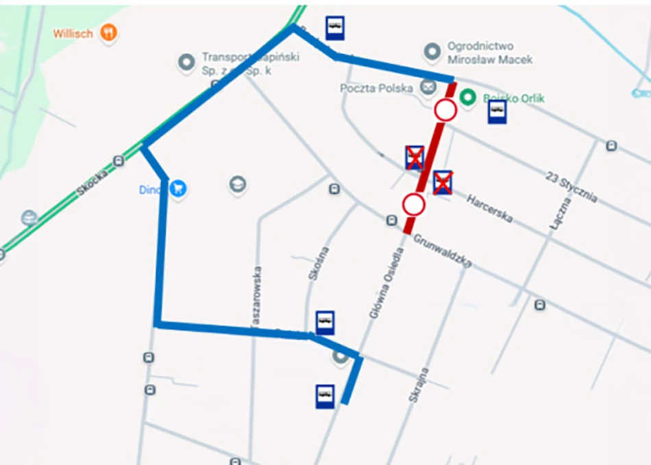 Najważniejsza informacja dla pasażerów dotyczy przystanków przy ulicy Głównej Osiedla. Na czas prowadzonych robót zostaną one całkowicie wyłączone z obsługi. Oznacza to, że autobusy nie będą się tam zatrzymywać.