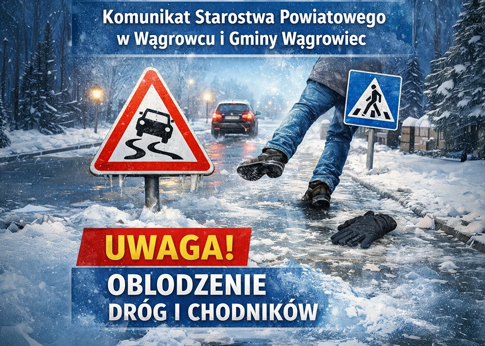 Sytuacja na drogach wymaga dziś ostrożności także od pieszych. Chodniki mogą być równie zdradliwe, jak jezdnie, a droga hamowania samochodów na oblodzonej nawierzchni wydłuża się. Jeśli nie trzeba, warto ograniczyć podróże. Jeśli trzeba — zwolnić, zwiększyć odstęp i liczyć się z tym, że nawet krótki odcinek może zająć więcej czasu niż zwykle.