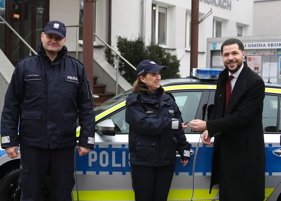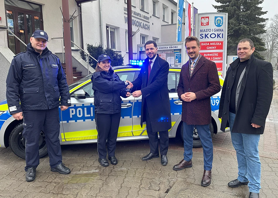 Uroczyste przekazanie radiowozu odbyło się przed Urzędem Miasta i Gminy Skoki. W wydarzeniu uczestniczyli: I Zastępca Komendanta Powiatowego Policji w Wągrowcu mł. insp. Łukasz Gulczyński, komendant Komisariatu Policji w Skokach kom. Kamila Kamińska oraz burmistrzowie Przemysław Renn i Wojciech Cibail.