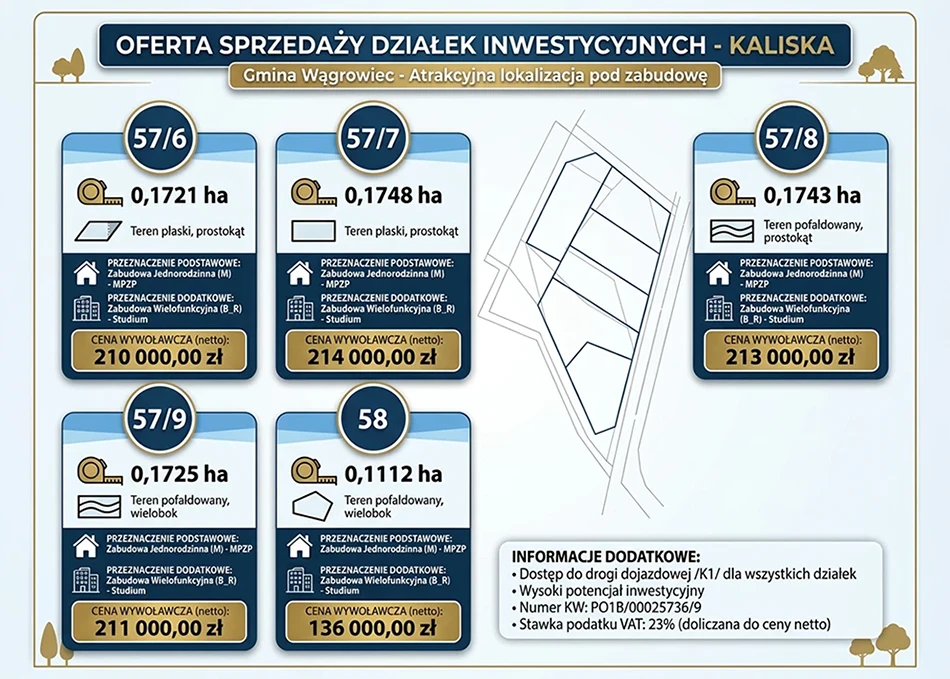 Wszystkie działki zostały przeznaczone do sprzedaży w drodze ustnego przetargu nieograniczonego. Łączna cena wywoławcza tych nieruchomości wynosi 984 tys. zł netto. Składają się na to kwoty: 210 tys. zł za działkę 57/6, 214 tys. zł za 57/7, 213 tys. zł za 57/8, 211 tys. zł za 57/9 oraz 136 tys. zł za działkę nr 58.