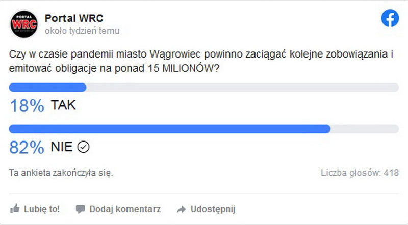 Na Facebooku przeprowadziliśmy jednodniową sondę, w której zapytaliśmy Was: "Czy w czasie pandemii miasto Wągrowiec powinno zaciągać kolejne zobowiązania i emitować obligacje na ponad 15 MILIONÓW?"