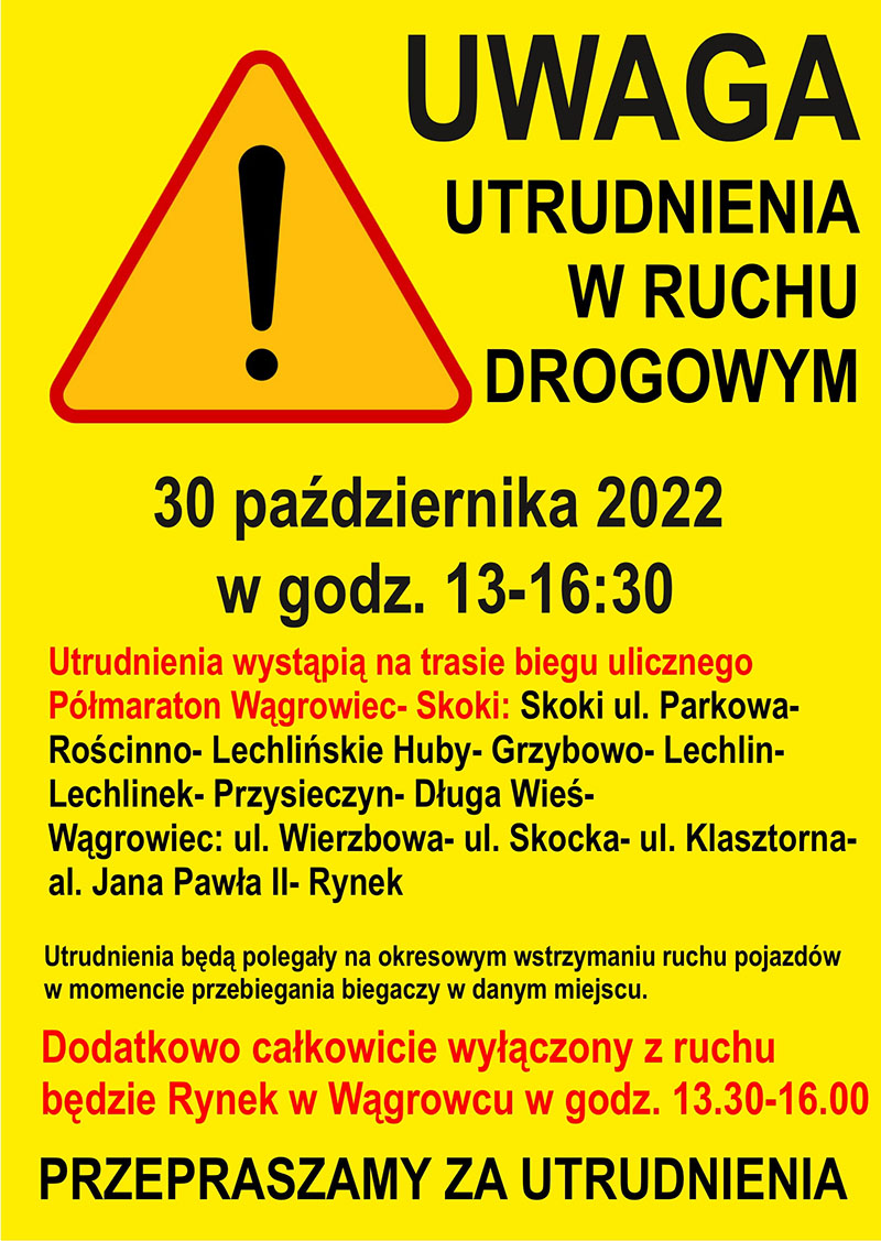 W związku z organizacją półmaratonu, 30 października w godzinach od 1300 do 1630 kierujących czekać będą utrudnienia, nastąpi okresowe wstrzymaniu ruchu pojazdów w momencie przebiegania biegaczy w danym miejscu.