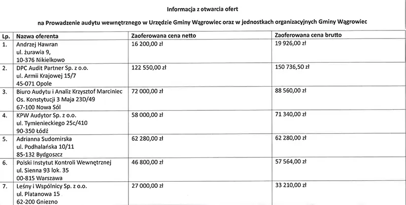 Na zapytanie ofertowe odpowiedziało siedmiu wykonawców, przedstawiając zróżnicowane propozycje cenowe.