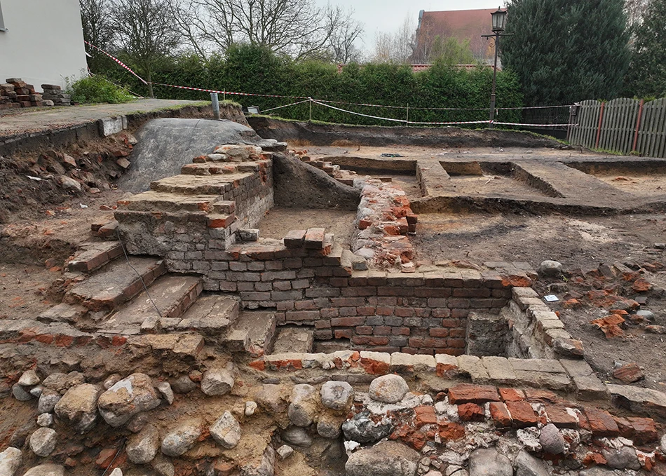 Plan budowlany zatrzymał jednak grunt. Podczas robót ziemnych natrafiono na relikty dawnej architektury murowanej. To wystarczyło, by wstrzymać prace i skierować na miejsce archeologów. Ich badania potwierdziły, że pod ziemią zachowały się pozostałości dawnych zabudowań, a wraz z nimi pojawił się materiał zabytkowy: fragmenty ceramiki naczyniowej, kafli, kości zwierzęcych oraz monety.