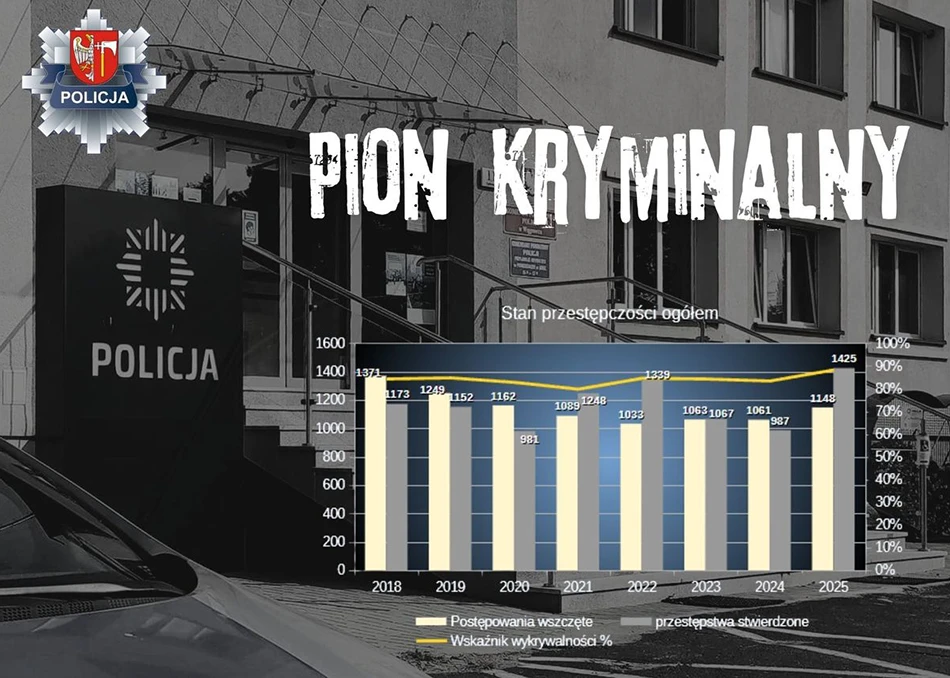 Bilans pionu kryminalnego z 2025 roku pokazuje dwie rzeczy naraz: z jednej strony dominację „codziennej” przestępczości (włamania, kradzieże), z drugiej – rosnącą wagę spraw narkotykowych i gospodarczych, które wymagają czasu, pracy operacyjnej i żmudnych czynności procesowych.