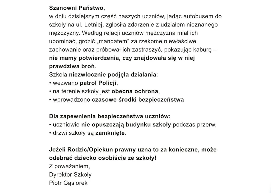 Jak wynika z relacji jednego z rodziców, w pojeździe pojawił się mężczyzna, który miał grozić dzieciom „mandatem”, a przy tym mógł mieć kaburę na broń. Rodzic twierdzi, że o zdarzeniu został poinformowani za pośrednictwem elektronicznego dziennika. Nasza redakcja zapytała policję, co faktycznie ustalono.