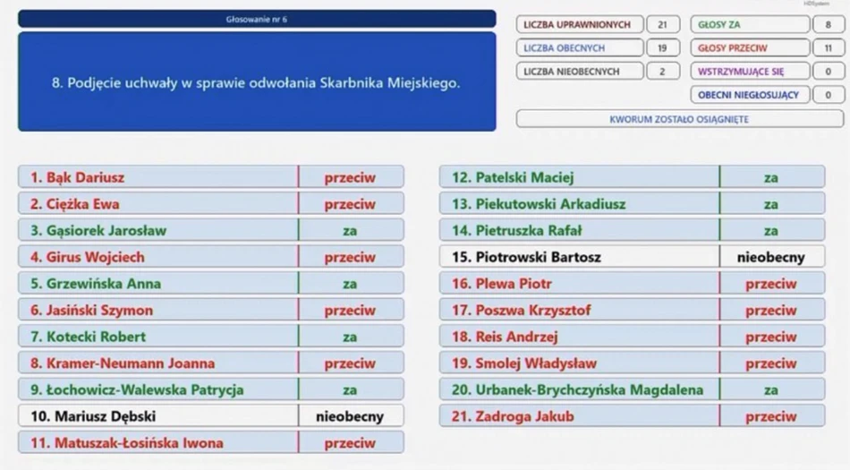 W sprawie jednej z najważniejszych funkcji w samorządzie większość radnych nie stanęła po stronie burmistrzyni. W głosowaniu udział wzięło 19 radnych. Za odwołaniem skarbnika opowiedziało się 8 radnych, przeciwko było 11 radnych i nikt się nie wstrzymał. Skarbnik pozostaje więc na stanowisku, a temat jego odwołania znów kończy się niepowodzeniem.