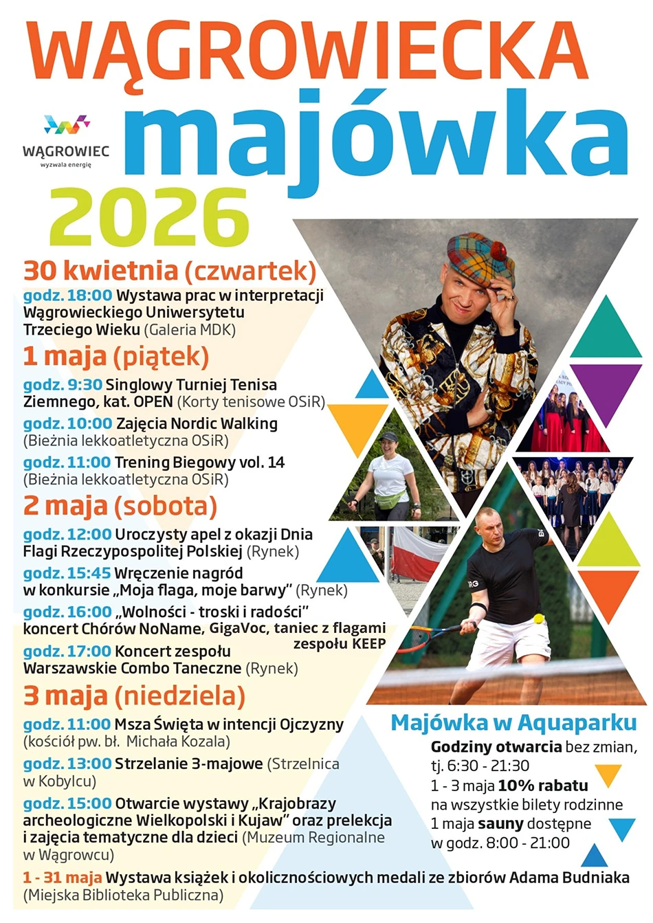 Miasto postawiło na sprawdzony, bezpieczny zestaw: wernisaż, sportową rekreację, oficjalne obchody Dnia Flagi, koncert w spokojnym tonie, mszę za Ojczyznę, strzelanie Bractwa Strzeleckiego i muzealną wystawę archeologiczną. W programie są też drobne dodatki, rabat rodzinny w aquaparku i wydłużone godziny saun. To oferta wyraźnie urzędowa i pozbawiona mocniejszego akcentu, który mógłby przyciągnąć tłumy.