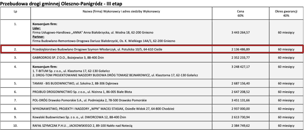 Gmina Gołańcz zabezpieczyła na to zadanie 3 215 968,90 zł. Po przetargu okazało się, że Przedsiębiorstwo Budowlano-Drogowe Szymon Włodarczyk (Cieśle) wykonana przebudowę za 2 136 486,89 złotych. To ponad milion mniej od kwoty założonej przez gołaniecki samorząd.