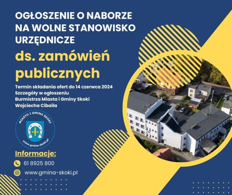 Burmistrz Miasta i Gminy Skoki ogłasza nabór na wolne stanowisko urzędnicze w Urzędzie Miasta i Gminy Skoki. Poszukiwany kandydat na stanowisko ds. zamówień publicznych.