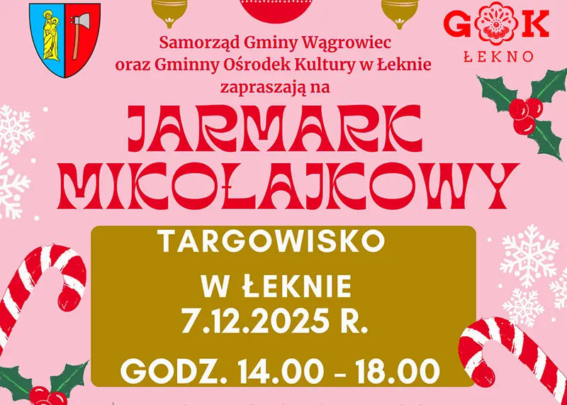 Samorząd Gminy Wągrowiec oraz Gminny Ośrodek Kultury w Łeknie zapraszają mieszkańców na Jarmark Mikołajkowy. Wydarzenie odbędzie się w niedzielę 7 grudnia 2025 roku na Targowisku w Łeknie, w godzinach od 14.00 do 18.00.