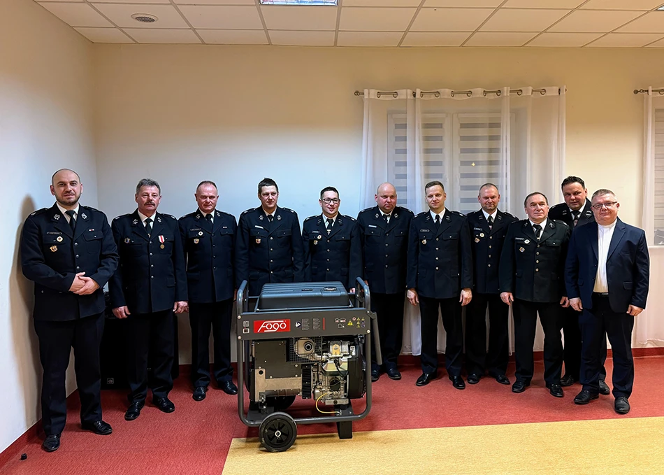 Zebranie miało też wymiar praktyczny: podczas spotkania oficjalnie przekazano nowy agregat prądotwórczy FOGO FV20 000 TRE. To przenośny generator o mocy znamionowej trójfazowej 17,5 kVA (14 kW) i prądzie znamionowym 25,4 A. W standardzie wyposażenia znajdują się m.in. cyfrowa stabilizacja napięcia AVR, duży zbiornik paliwa, gniazda 400V32A oraz 230V 16A, czujnik ciśnienia oleju, zabezpieczenie przeciążeniowe, akumulator, tłumik z przyłączem do węża spalinowego i licznik czasu pracy.
