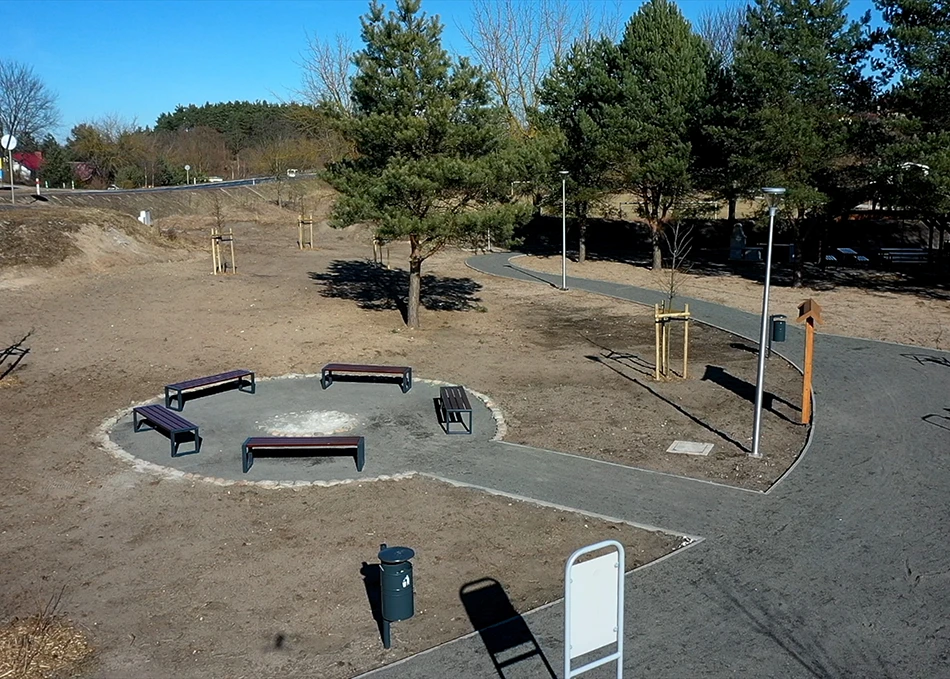 Zadbano też o element integracyjny. Na terenie parku przygotowano miejsce na ognisko z ławkami, postawiono drewnianą wiatę i wykonano murowany grill. Dla rowerzystów przewidziano stację naprawy połączoną ze stacją ładowania rowerów elektrycznych. Obok powstał parking na 10 miejsc, w tym jedno dla osób z niepełnosprawnościami.