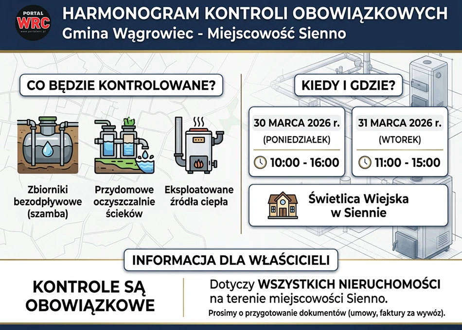 Mieszkańcy Sienna muszą przygotować się na obowiązkowe kontrole prowadzone przez pracowników Urzędu Gminy Wągrowiec. Jak poinformowała wójt, sprawdzenia obejmą zarówno gospodarkę wodno-ściekową na posesjach, jak i użytkowane źródła ciepła.