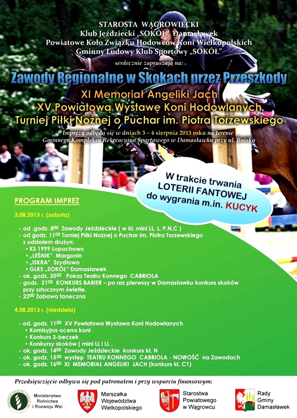 Serdecznie zapraszamy na XI Memoriał Angeliki Jach, XV Powiatową Wystawę Koni Hodowlanych oraz Turniej Piłki Nożnej.