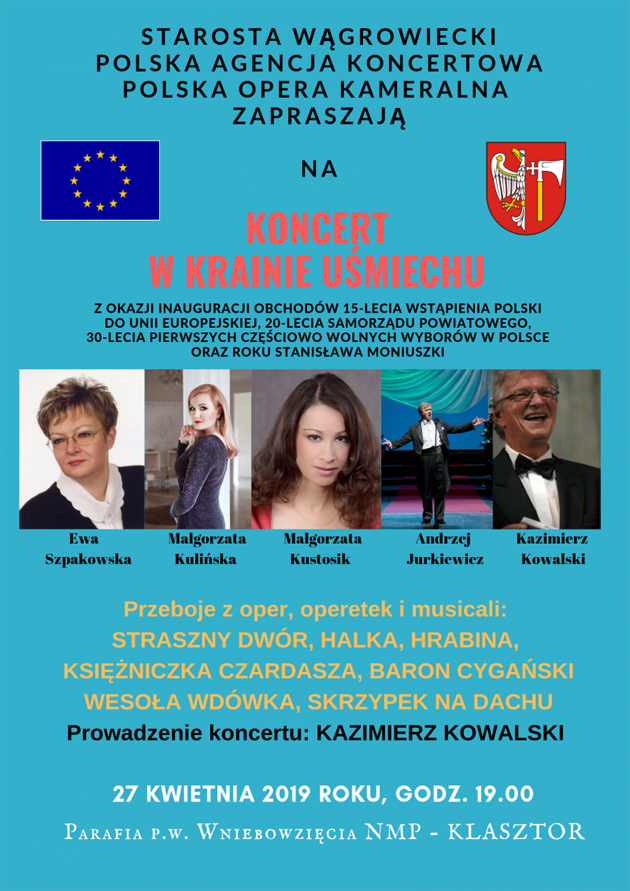 Koncert "W Krainie Uśmiechu" z okazji inauguracji obchodów 15-lecia wstąpienia Polski do Unii Europejskiej, 20-lecia samorządu powiatowego, 30-lecia pierwszych częściowo wolnych wyborów w Polsce oraz roku Stanisława Moniuszki.