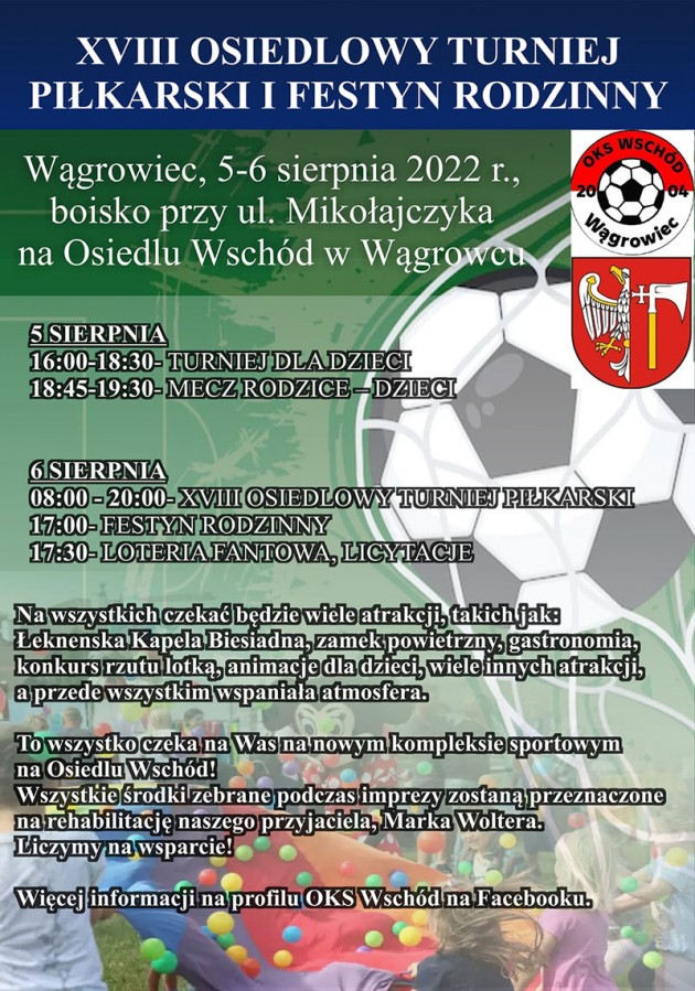 Turniej organizowany przez OKS Wschód odbędzie się na boisku przy ul. Mikołajczyka w Wągrowcu. W piątek 5 sierpnia od godziny 1600 rozpocznie się turniej dla dzieci. O 1845 rozegrany zostanie mecz rodzice kontra dzieci.